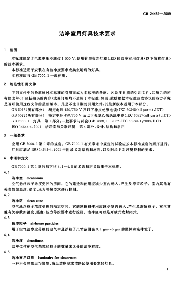 GB24461-2009 潔凈室用燈具技術(shù)要求